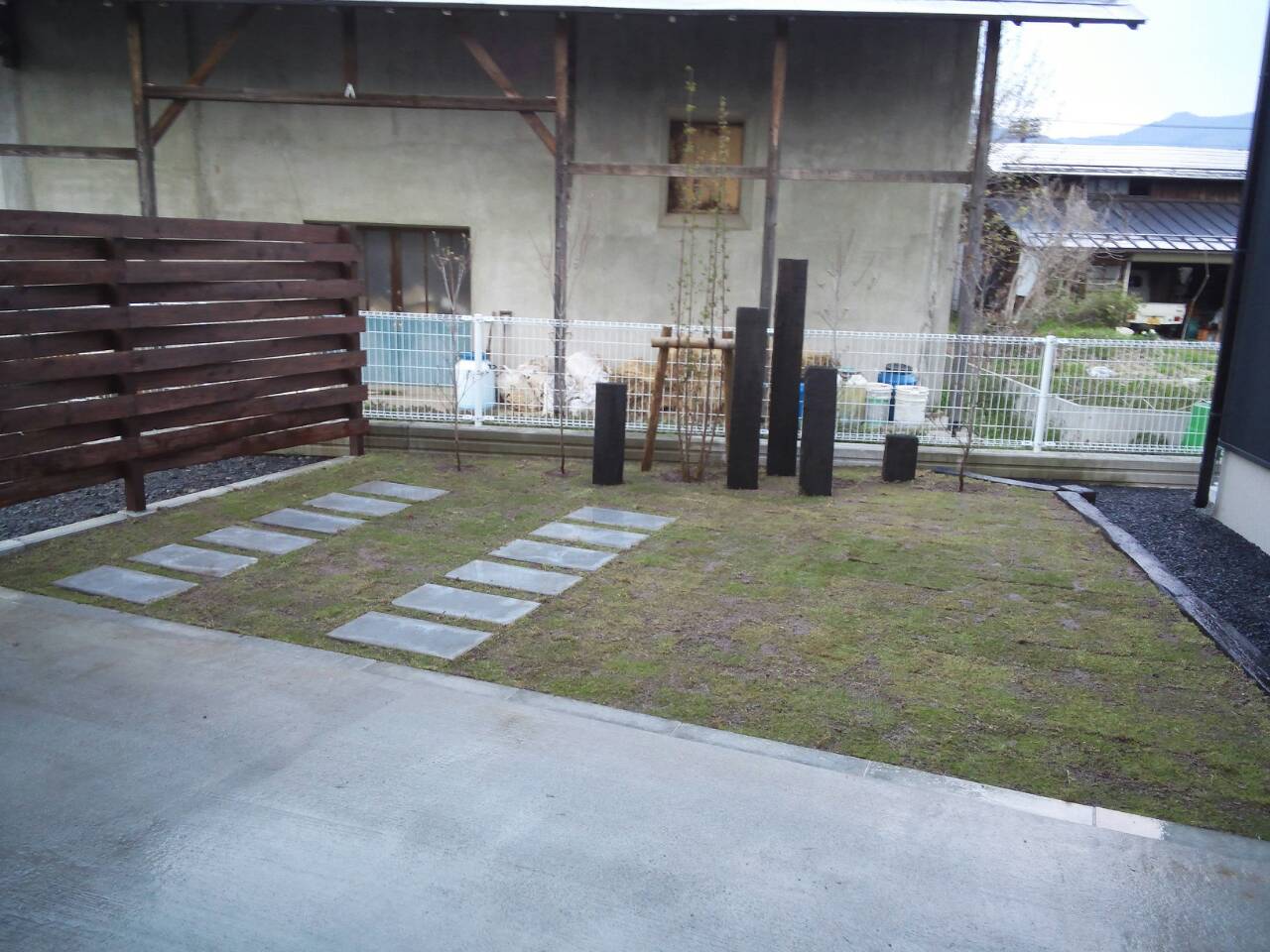 道路との目隠し板塀、必要に応じて芝の中まで車が入れるようにしています。