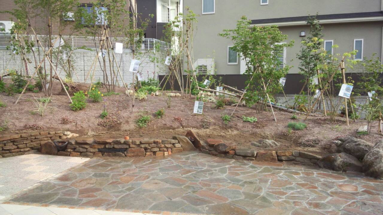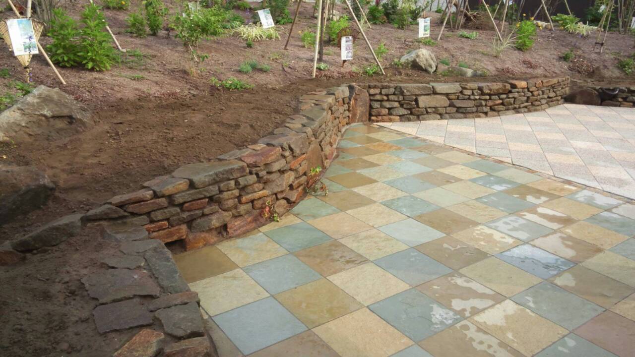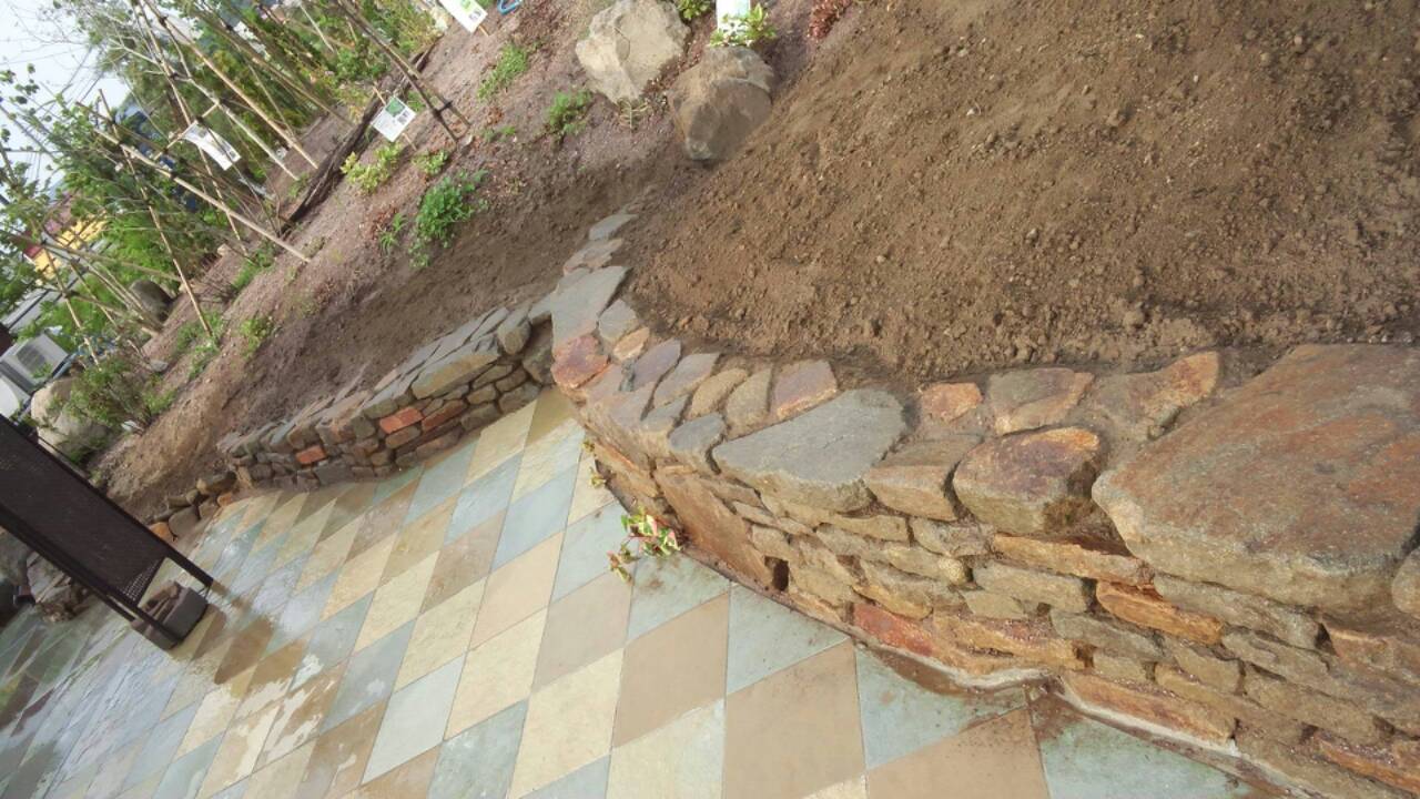 大勢でのガーデンパーティーの際に、腰を掛けられるような石積設計。