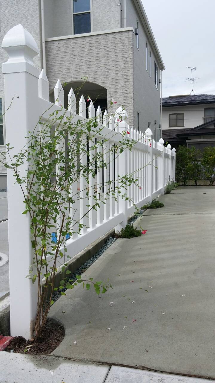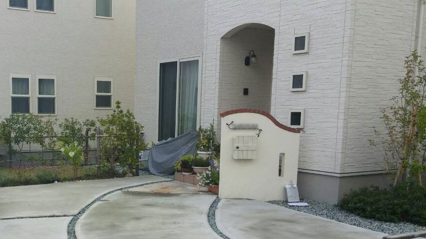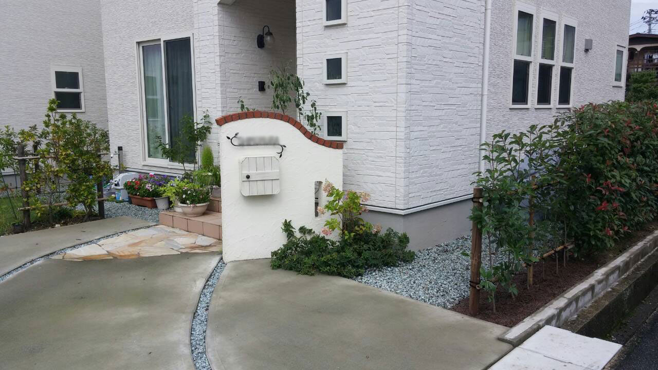 門柱の周りがさみしかったので庭にあった草木を移植し、将来、玄関の目隠しも含め、玄関周りを整備しました。隣家との境界には樹脂製のフェンスを設置しました。